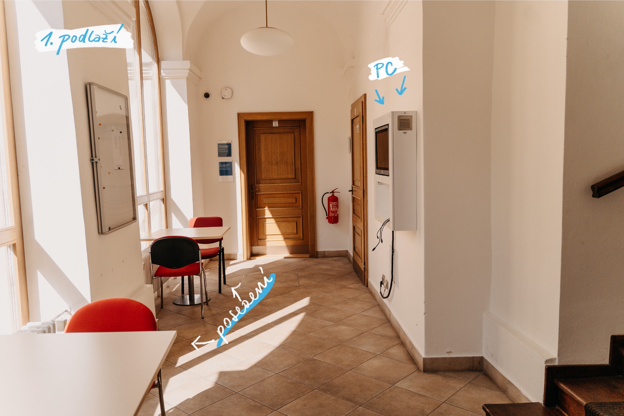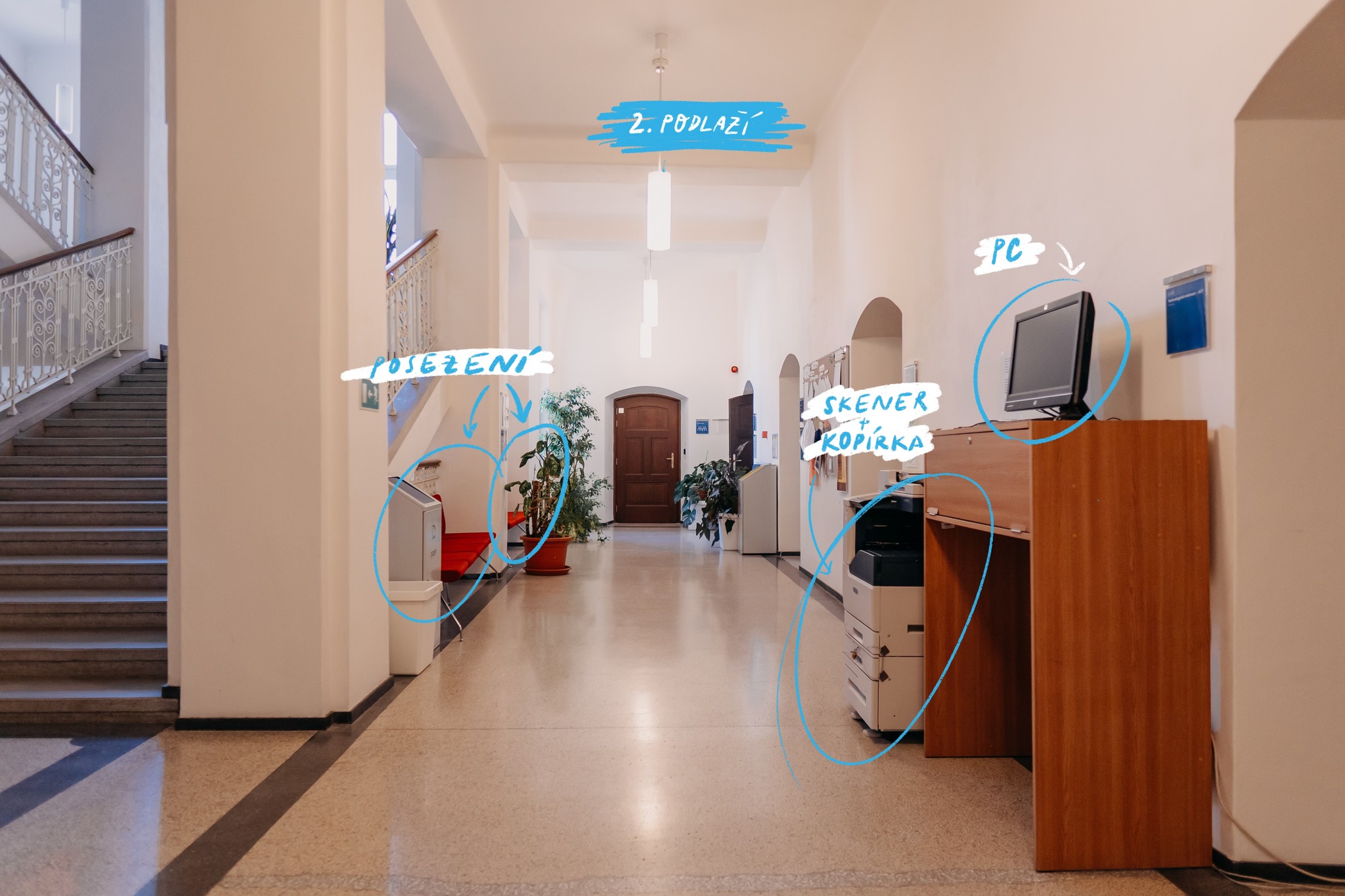 1. podlaží chodba, 2. podlaží- studentský koutek, č. 2.23, 2. podlaží chodba